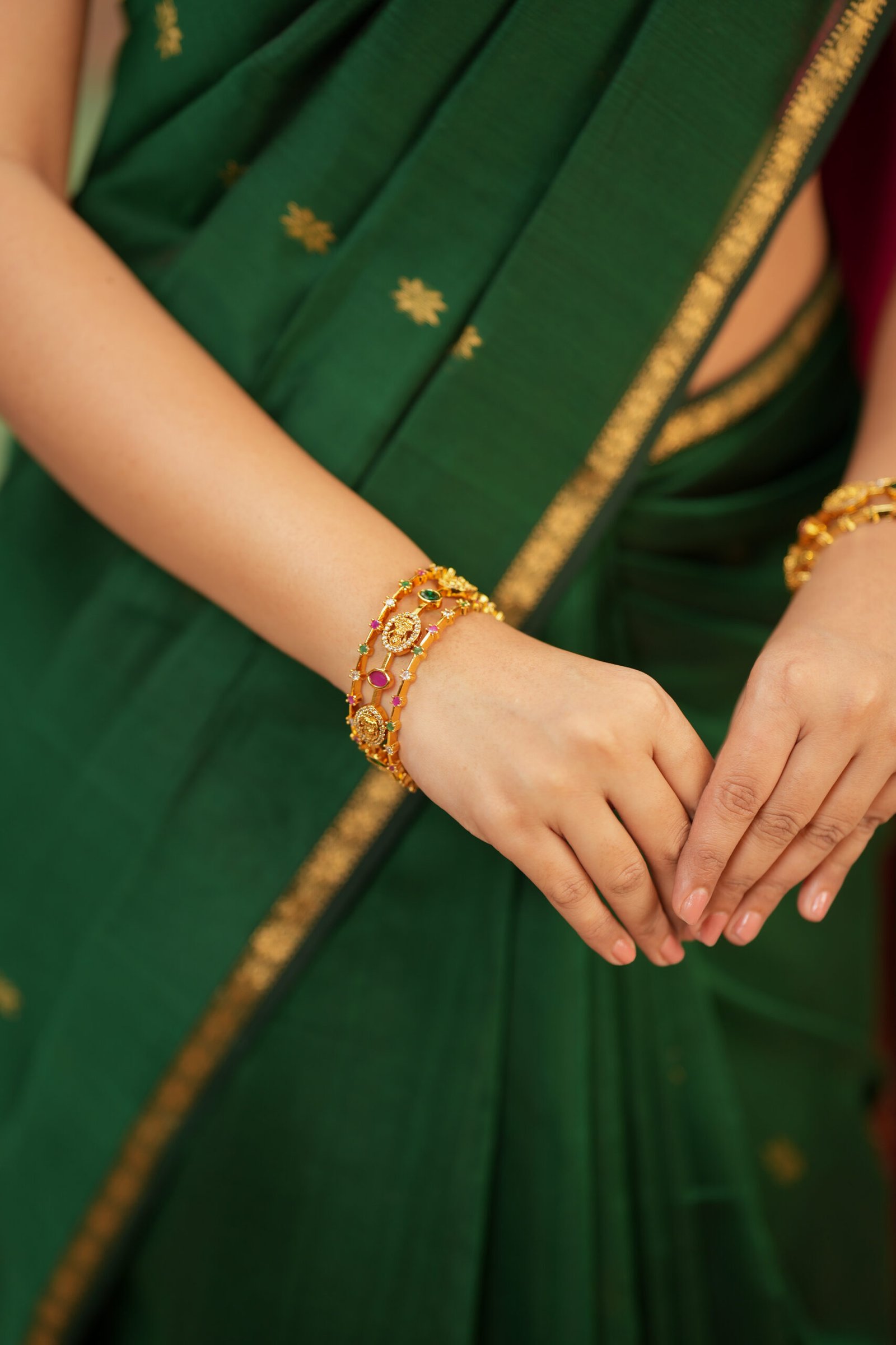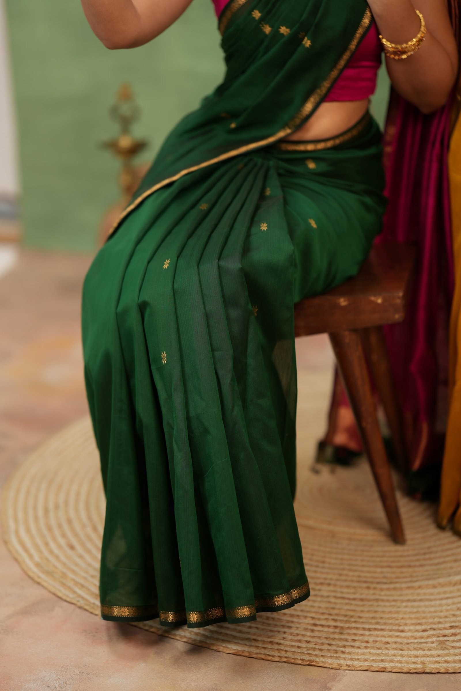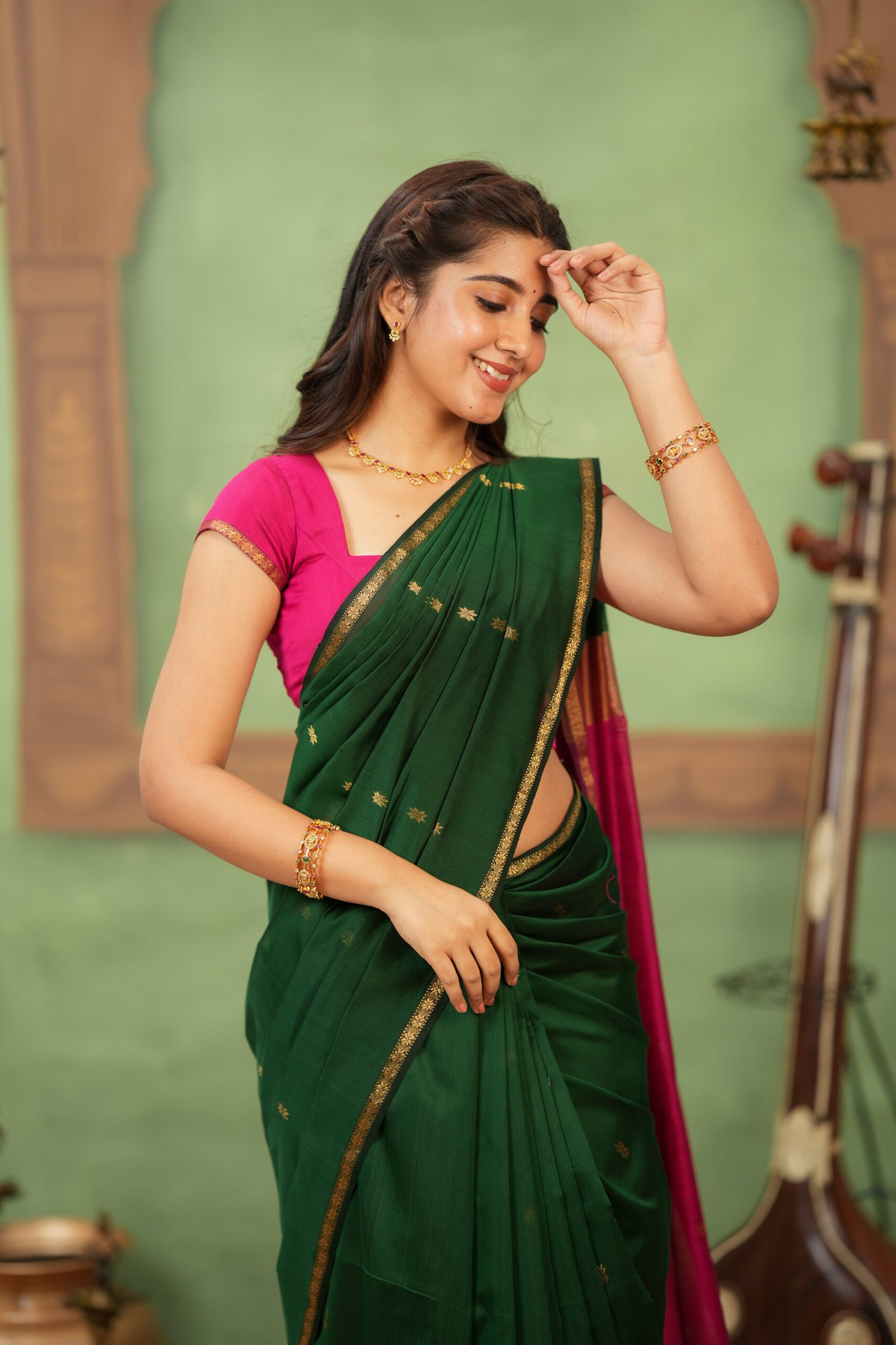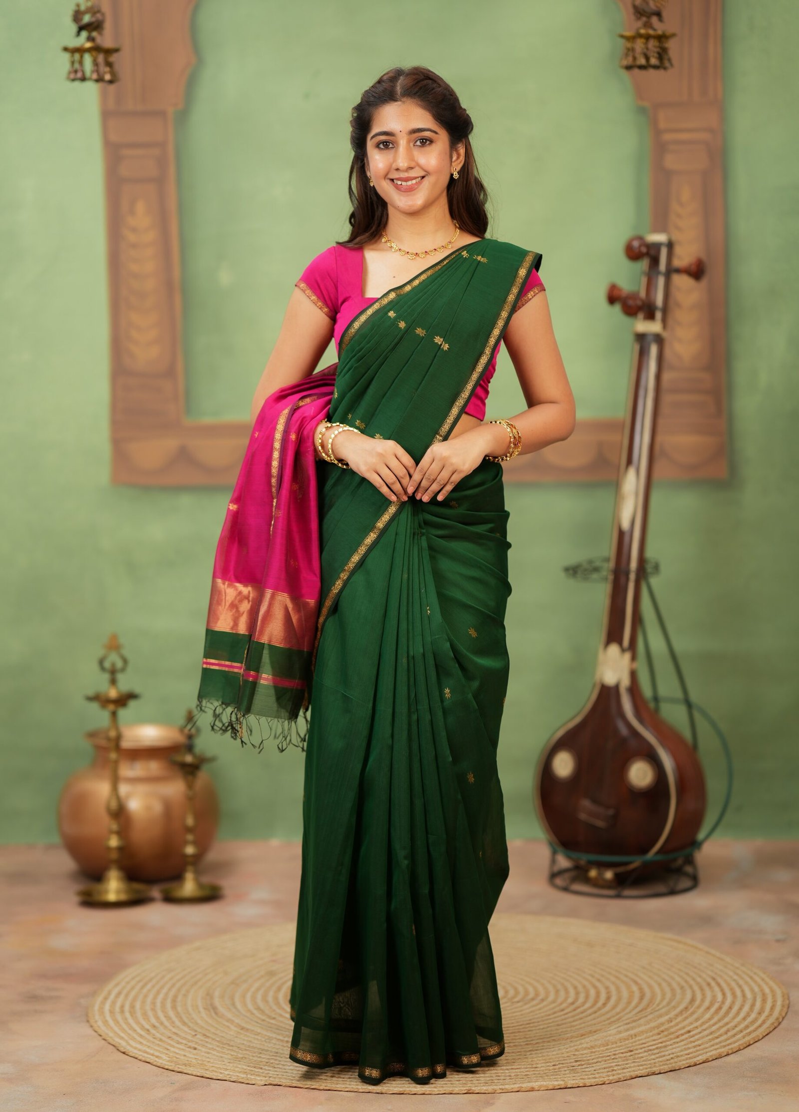 Maheshwari silk saris are crafted from a blend of silk and cotton, which gives them a unique, lightweight feel while maintaining the luxurious sheen of silk.