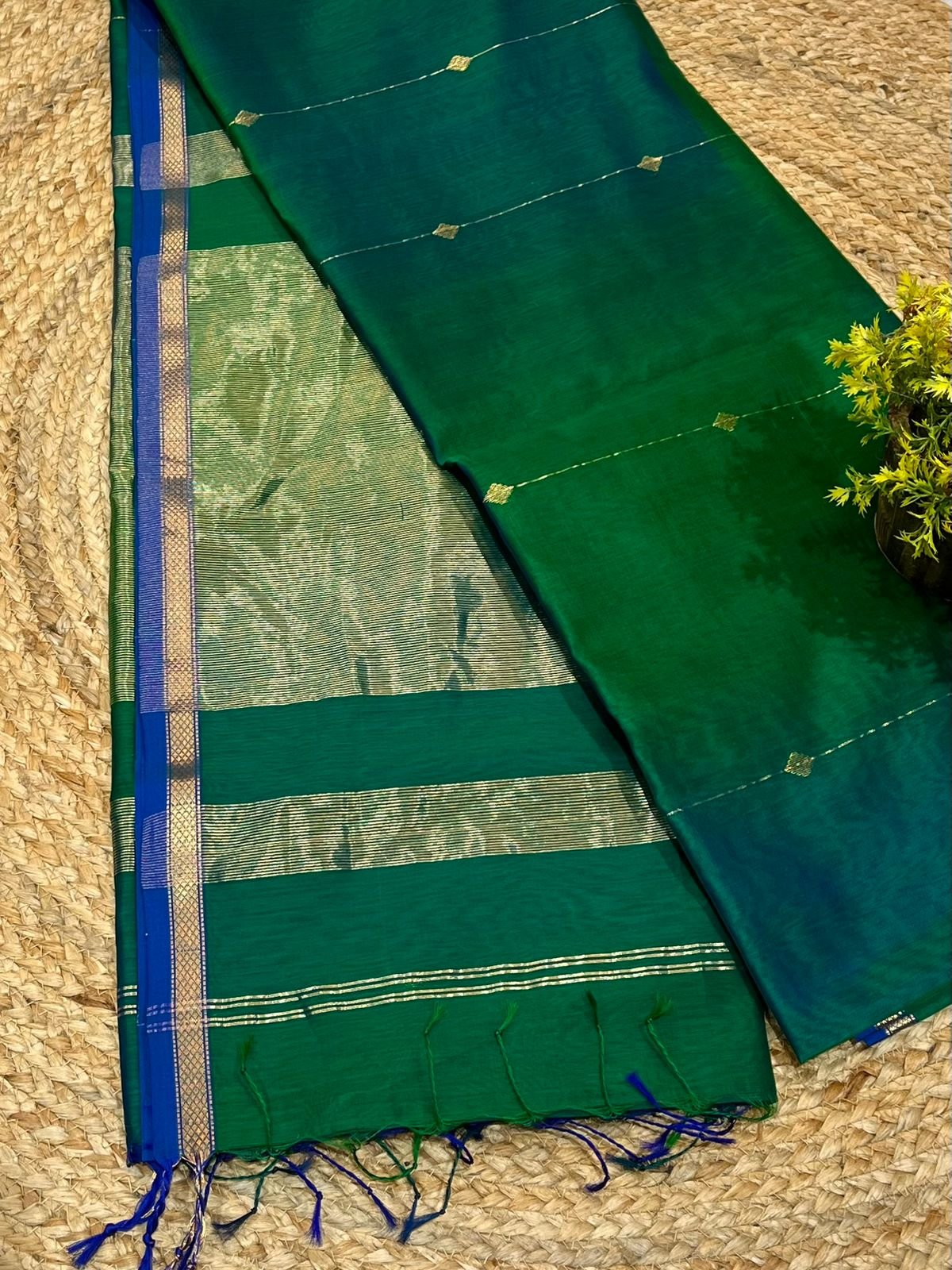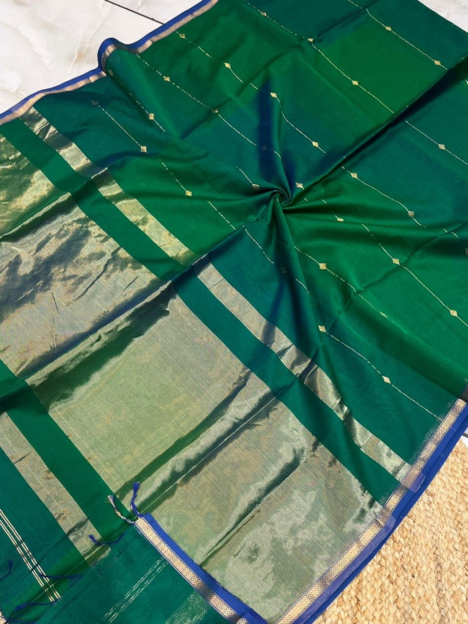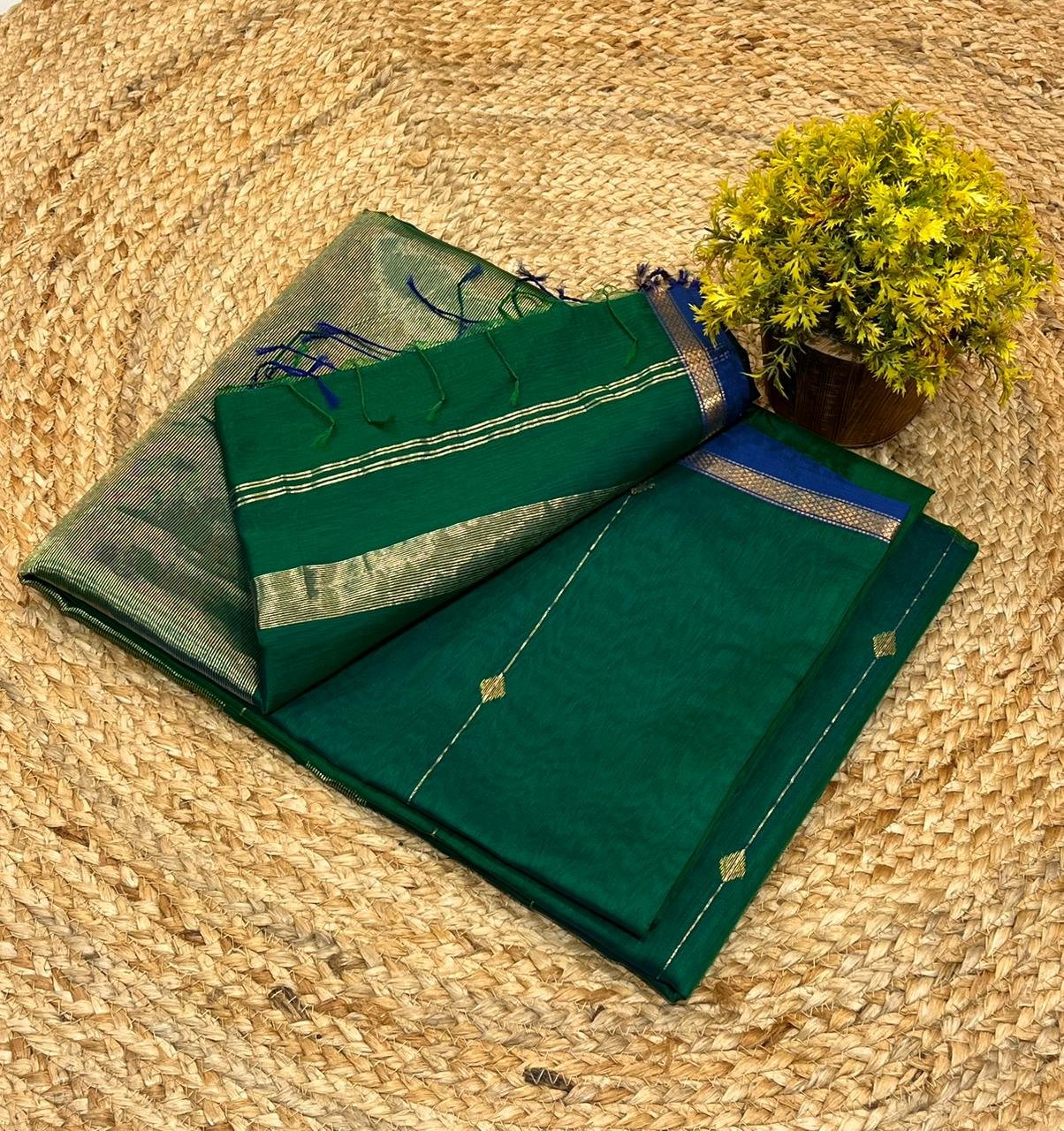 An absolutely stunning vibrant sari with hues of emerald green and rich blues like the feathers of a peacock with diamond motif in gold. Woven in pure handloom Maheshwari silk cotton, the sari comes with a running blouse.