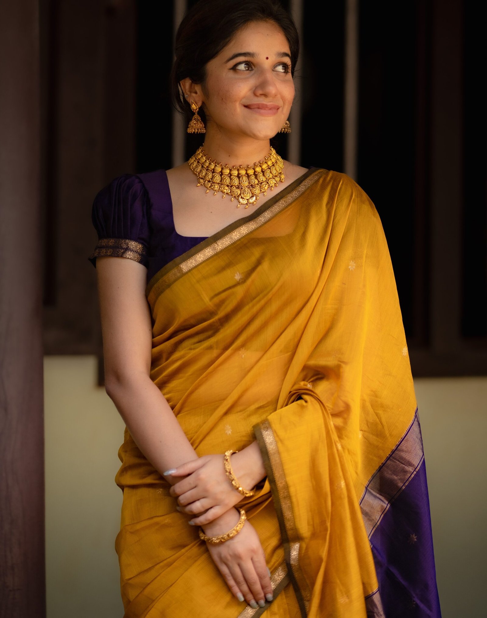 Maheshwari silk saris are crafted from a blend of silk and cotton, which gives them a unique, lightweight feel while maintaining the luxurious sheen of silk.